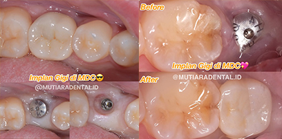 Penanaman akar gigi buatan (bahan dari titanium) ke dalam tulang rahang untuk menggantikan gigi yang hilang, berfungsi sebagai fondasi kokoh untuk mahkota gigi tiruan yang dipasang di atasnya, memberikan solusi permanen yang mirip gigi asli dalam fungsi, estetika, dan kenyamanan.